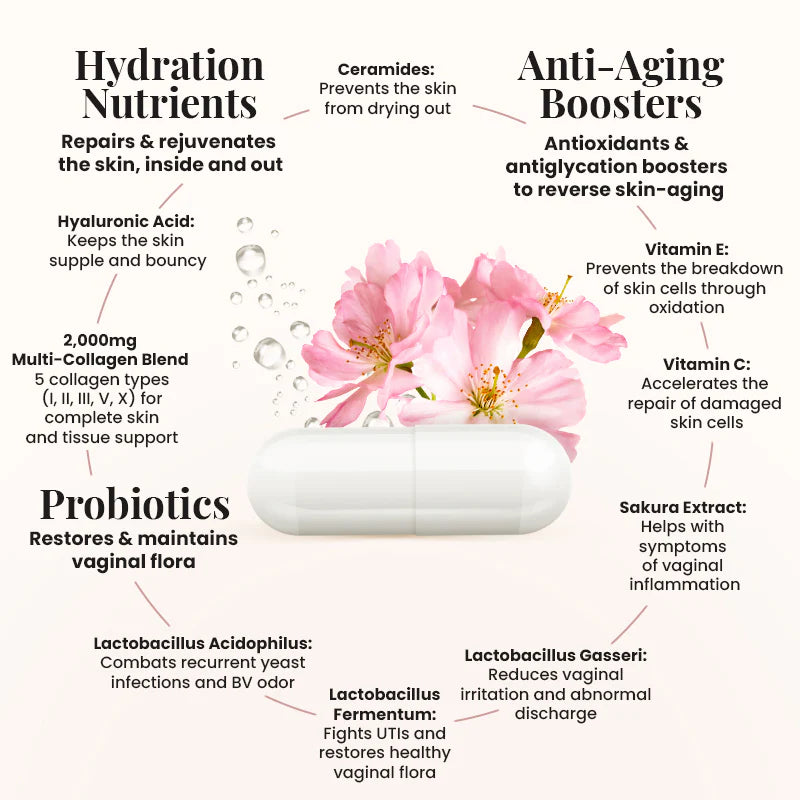 ✅ Re-balance the vaginal microbiome & PH levels caused by declining collagen and hyaluronic acid.
