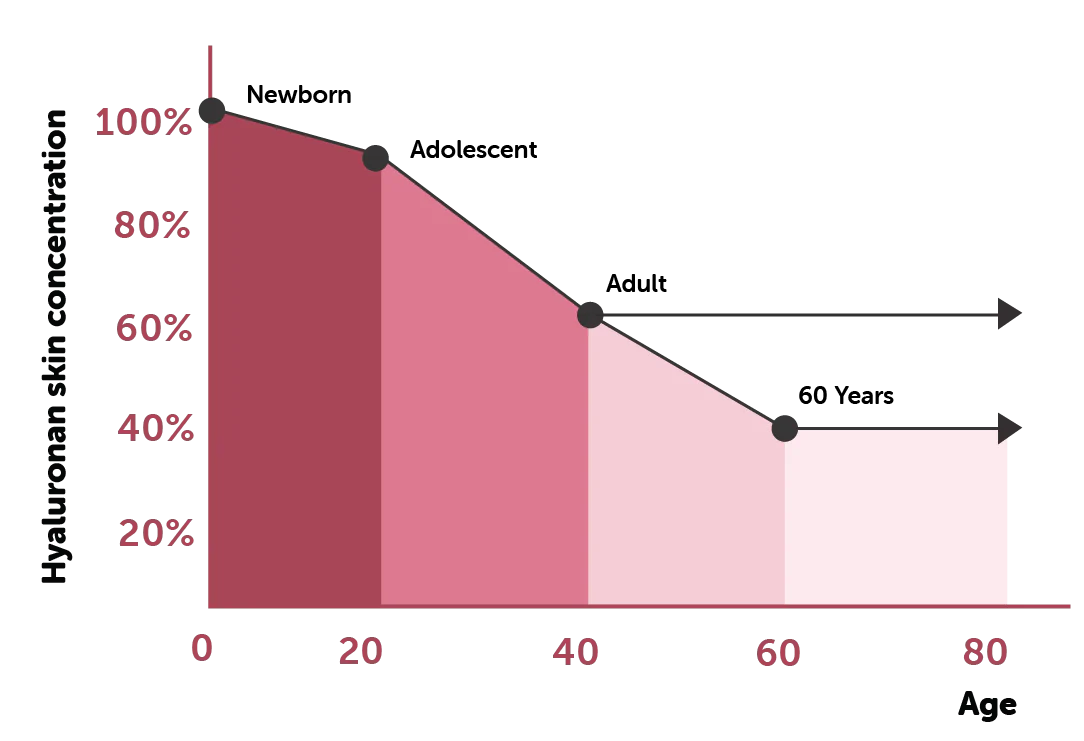 And here’s a graph showing the decline in hyaluronic acid that creates moisture & wetness in the skin